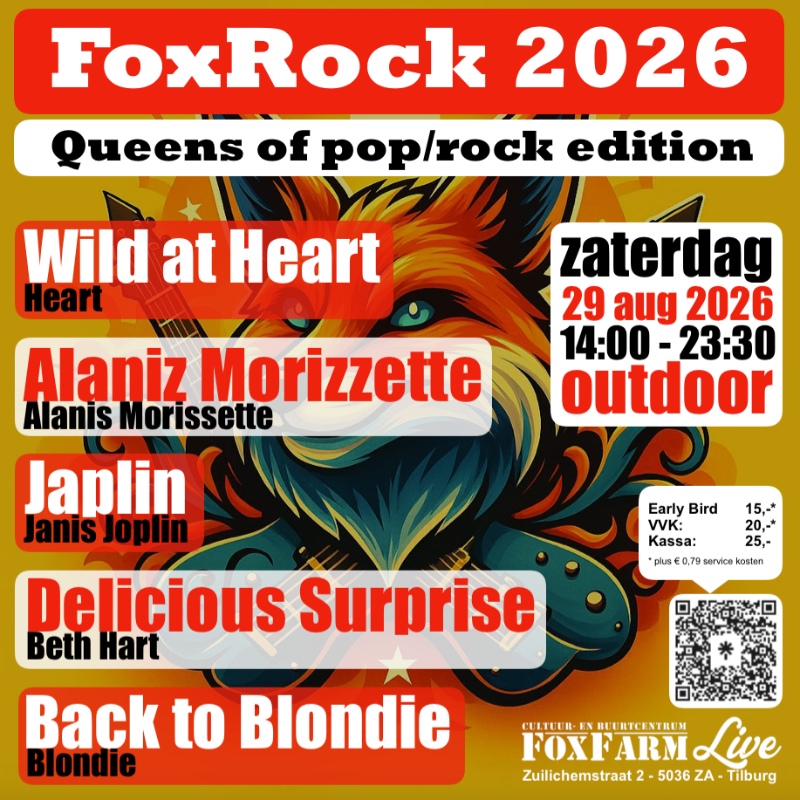 Op zaterdag 29 augustus 2026 gaat letterlijk en figuurlijk het dak eraf tijdens de vierde editie van het zinderende, outdoor festival FoxRock 2026! Dit jaar eren we de absolute koninginnen van pop en rock met een line-up om je vingers bij af te likken. Krachtige vrouwenstemmen, legendarische songs en pure rock-’n-roll energie.